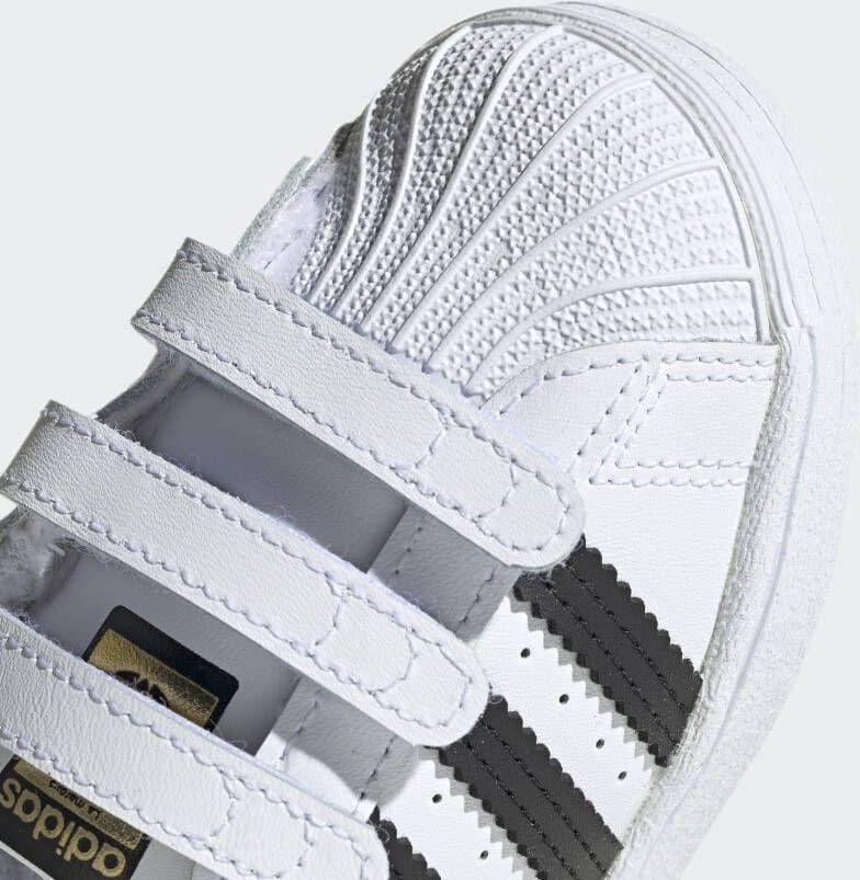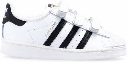 Met deze witte Superstar lage sneaker met klittenbandsluiting, Superstar CF I, laat Adidas ook de kleintjes kennis maken met hun originals. Dit item is gevoerd met mesh en de upper is van leer met zwarte lederlook details. De authentieke 3-Strips zijn gekarteld, daartussen zitten kleine perforatiegaatjes. Ander authentiek element bij de Superstar sneaker uit de jaren '70 is de rubberen shell-toe. Op de tong en op de hiel is een merkopdruk verwerkt. De rubber zool heeft een grof visgraatprofiel.