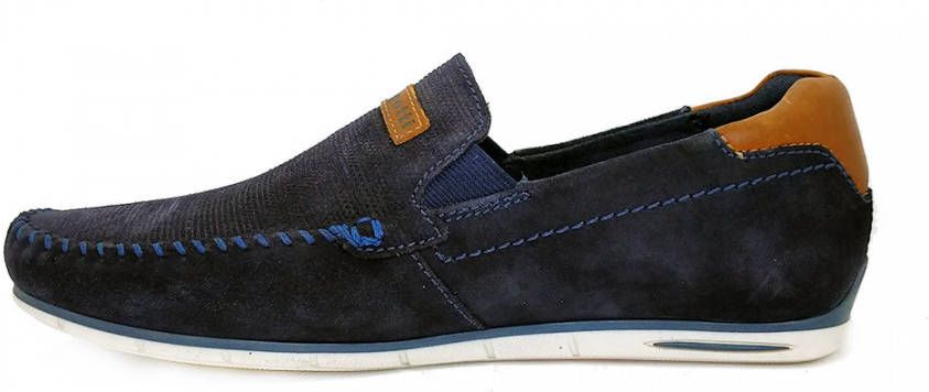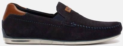 Bugatti instapper in het donkerblauw met cognac accenten voor heren. Deze schoen heeft een bovenwerkt van leer. De binnenvoering is gemaakt van textiel en de schoen heeft een kunststof zool.