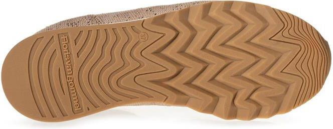 Een spiksplinternieuwe stijl uit de eigen collectie van het merk Floris Van Bommel, dat is deze beige lage sneaker Sfw-10060. Ook dit keer weet Floris je te verrassen met een unieke stijl! Het bovenwerk is gemaakt van klassiek nubuckleer en krijgt een robuust karakter dankzij de print die in het leer gedrukt is en de metallic folie die zorgt voor een speelse touch over het gehele bovenwerk. Deze casual sneaker is gesierd met een opvallend rubber merklabel op de tong, een witte hielcap met het kenmerkende rubberen F-embleem in een mooie roze kleur en het merkreliëf achter op de zoolrand. Ook aan dit model zie je weer dat aan ieder detail is gedacht, zo heeft hij een leren binnenwerk met een uitneembaar roze voetbed. De witte rubberen zool met een zigzag belijning en een contrasterend kartelrand van het loopvlak zorgen voor een extra sportief uiterlijk. De zool heeft een hakhoogte van zo'n 3,5 cm waardoor je heel onopvallend wat extra centimeters mee pakt. Combineer deze toffe sneaker onder een mooie jeans voor een sportieve, stijlvolle look of juist supercasual onder een leuke rok of jurk!.