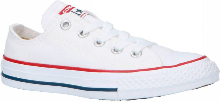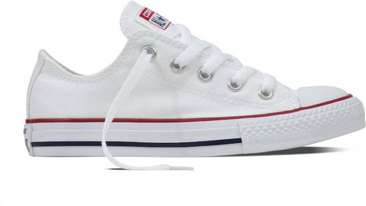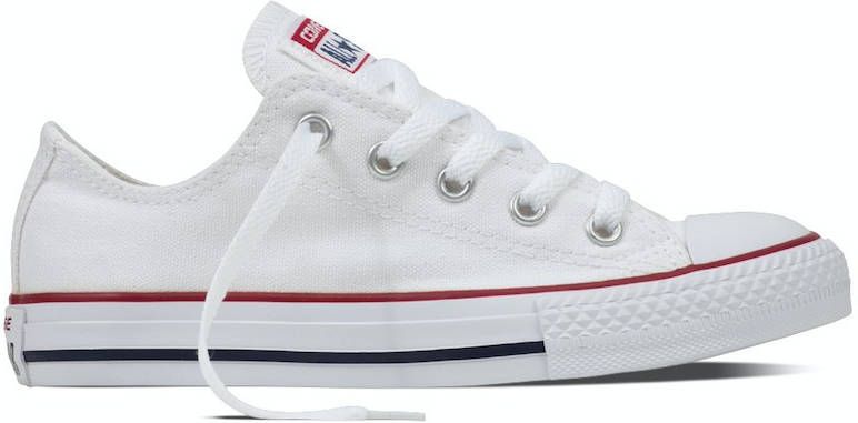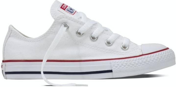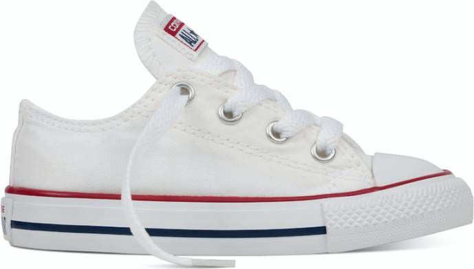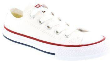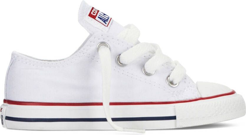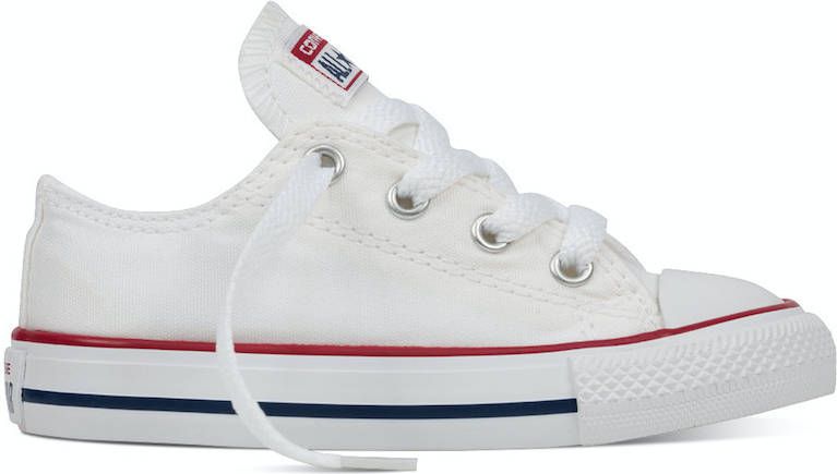 Deze klassieke lage All Star Converse-sneaker heeft een wit canvas bovenwerk, gevulkaniseerd rubberen zool, opvallende strepen en de 'All Star'-badge. Dit model van Converse is verkrijgbaar in kindermaten en een absolute must have.. Material: Bovenwerk van textiel / synthetische zool.