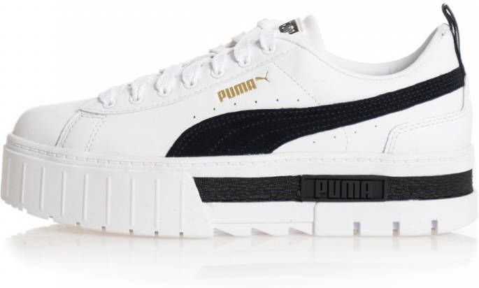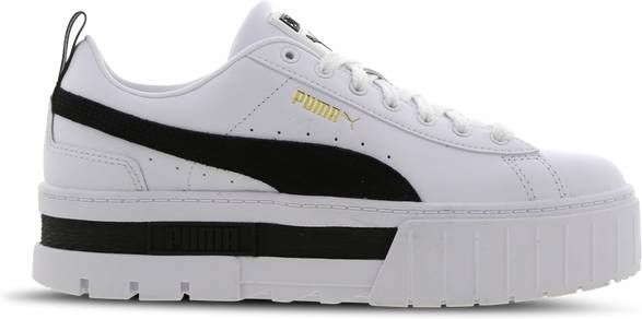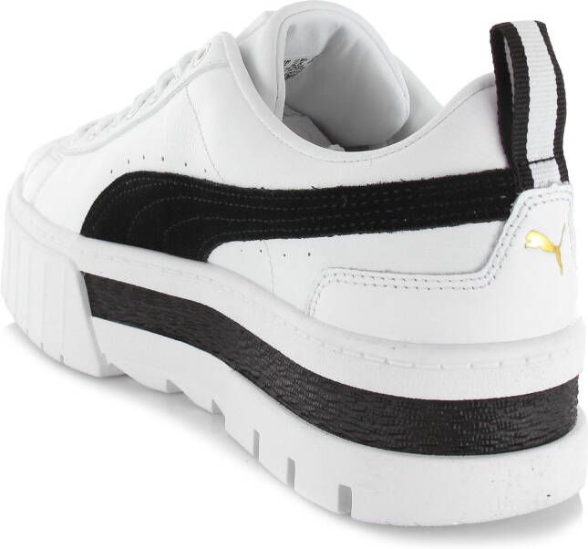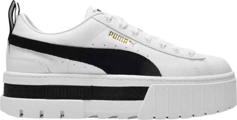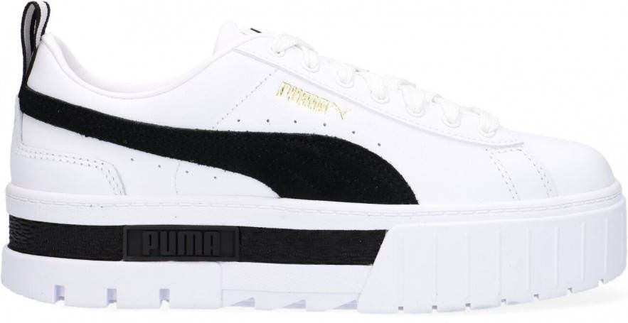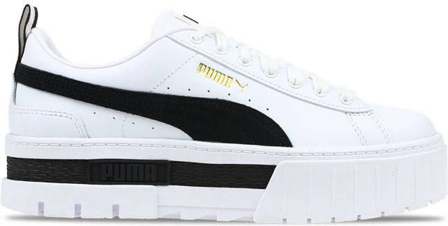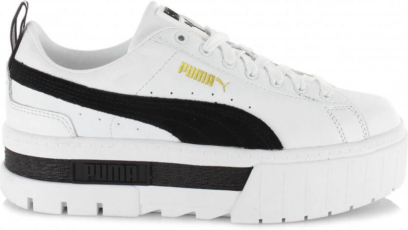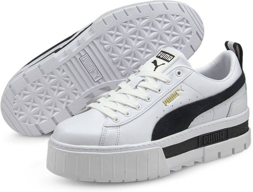 Sneakers voor damesMayze Lth 381983-01van Puma. Dit platformmodel heeft een bovenwerk van wit leer met synthetische overlays. De Puma side stripes zijn in zwart suède uitgevoerd. De lederen binnenkant is voorzien van een synthetisch uitneembaar voetbed. De statement rubberen zool met zwarte strip is circa 4 cm hoog. Rubberen Puma logo's zijn zichtbaar op de tong en in de zool. De gouden branding opzij en op het hielstuk geven de shoes een oldskool look. Een witte/zwarte sierlus en witte veters maken de coole sneaks tot slot compleet. Kleur: wit/zwart. (Puma White/Puma Black).