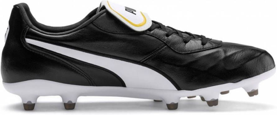 Voel je de koning van het natuurgrasveld met PUMA's zwarte King Top voetbalschoenen voor volwassenen. Klaar voor de wedstrijd?!- Bovenwerk: K-Leer