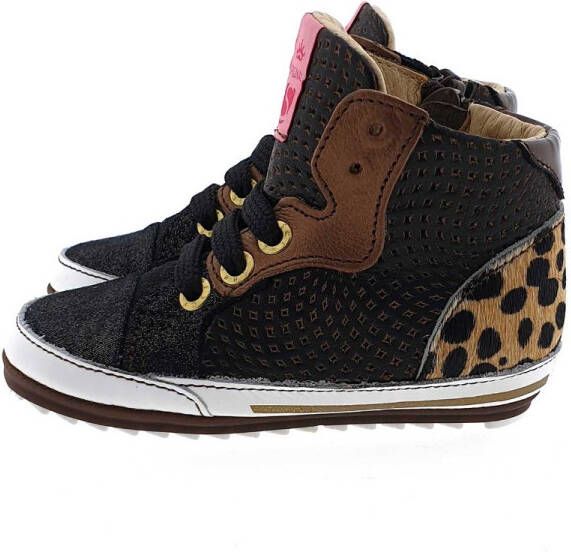 Shoesme sneakers met rits- en vetersluiting voor meisjes in de kleur zwart. Deze leren sneakers hebben een zijkant met metallic look en de hak heeft een overlay met luipaard print, hoe cool! De leren binnenzolen zijn uitneembaar en de gevoerde binnenkant zorgt voor extra comfort. De rubberen antislip zool is zeer soepel. Deze volwaardige schoentjes zijn zacht, soepel en voorzien van een speciaal antislip zooltje. De verstevigde hiel en het uitneembare lederen voetbed bieden steun en stabiliteit, waardoor een baby vanaf de eerste stapjes een goede houding heeft. De schoentjes zijn op de drukpunten verzacht en gefoamd, waardoor ze ook nog eens heerlijk zitten.